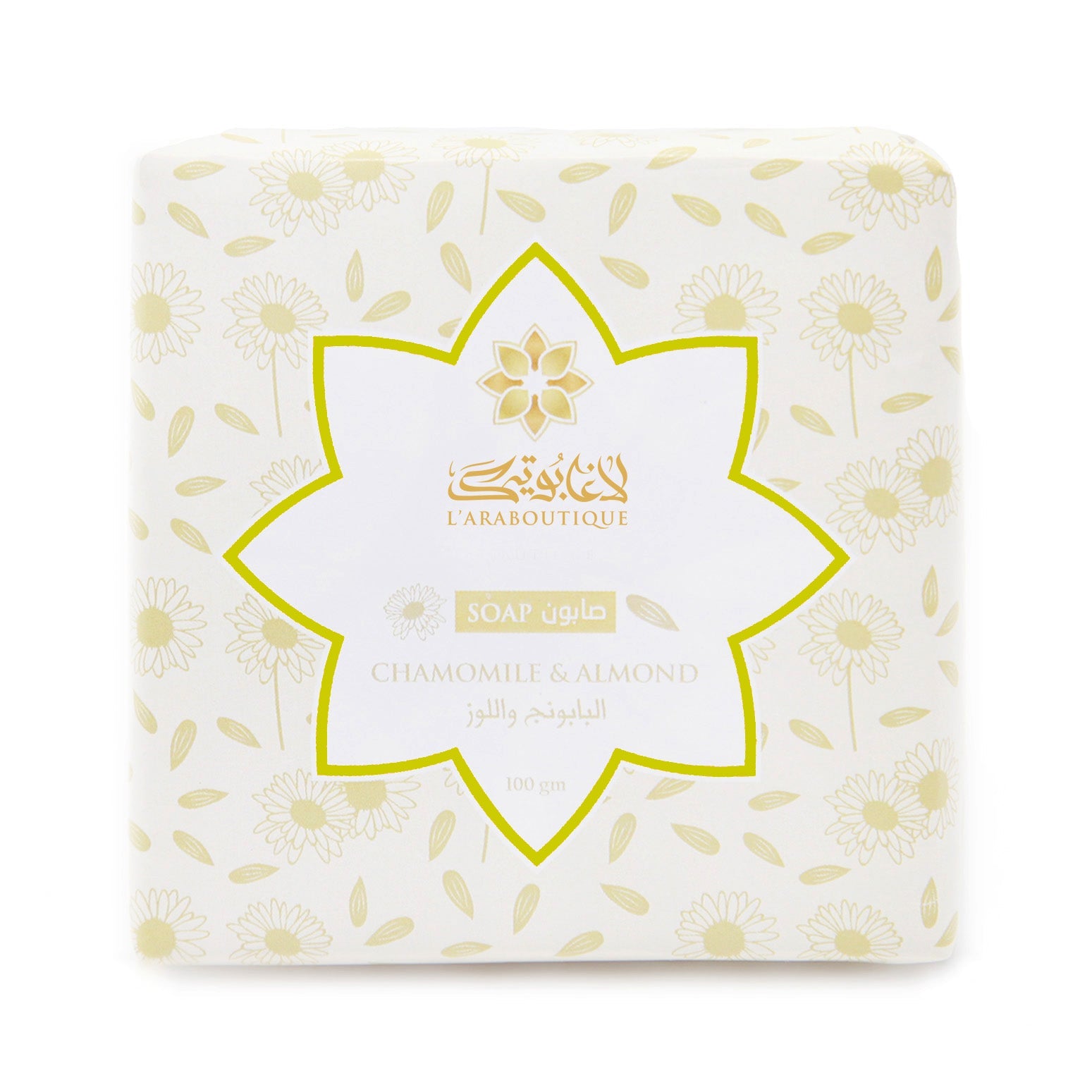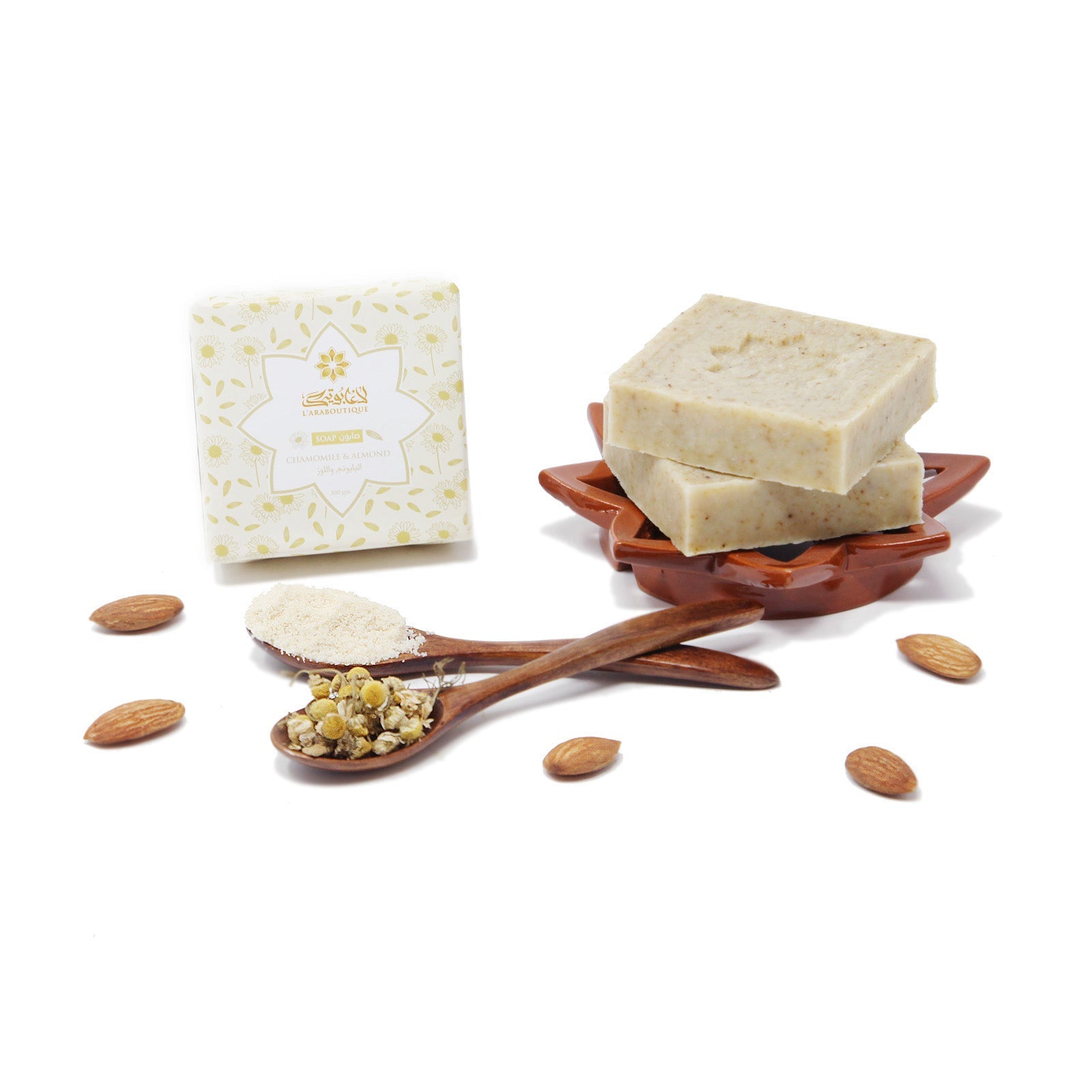 Sodium olivate (Extra virgin olive oil), Sodium sweet almondate (Extra virgin sweet almond oil), Aqua (distilled water), Sodium shea butterate (Organic shea butter), Glycerin, Sodium castorate (Extra virgin castor oil), Chamomilla recutita flower powder (Organic chamomile powder), Prunus amygdalus dulcis shell powder (Organic almond powder).