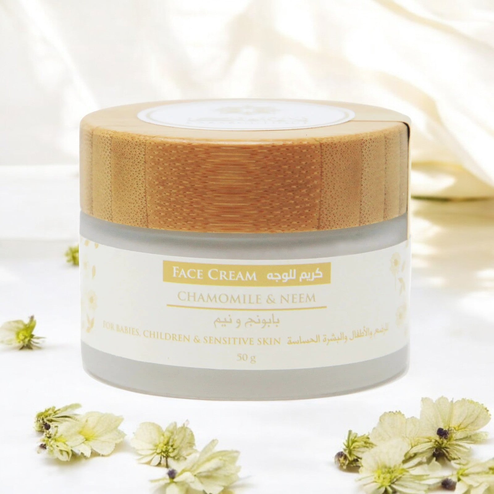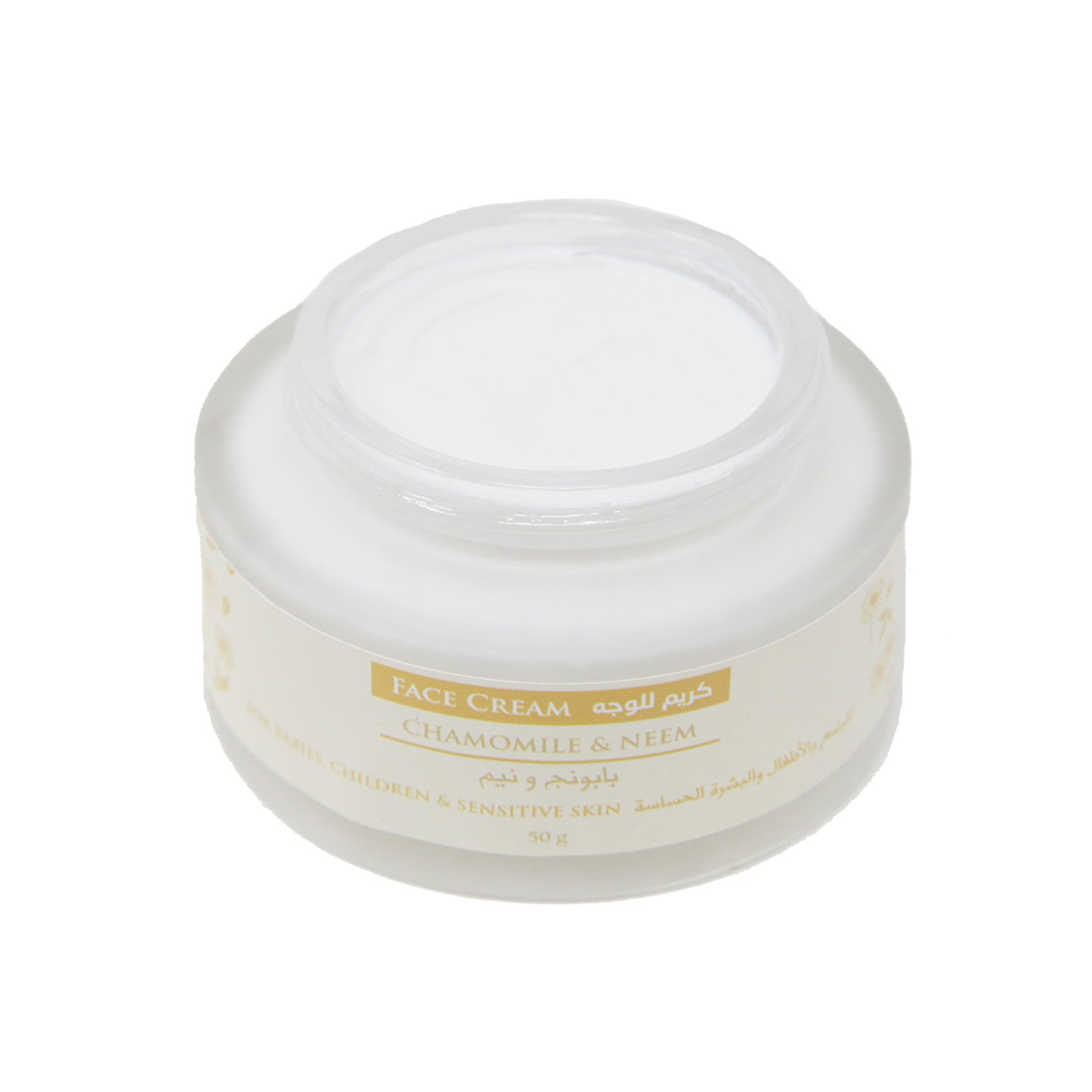Aqua (Zamzam mineral water), Prunus amygdalus dulcis seed oil (Extra virgin sweet & organic almond oil), Cetearyl olivate (Olive oil emulsifier), Sorbitan olivate (mix of organic compounds made from dehydrated sorbitol), Phenoxyethanol 0.9%, Anthemis nobilis flower oil (Organic chamomile oil), Vegetable glycerin, Triticum vulgare germ oil (Organic wheatgerm oil), Azadirachta indica leaf oil (Organic neem oil), Panthenol 0.17%, Tocopherol 0.12% (Pure Vitamin E), Ethylhexylglycerin 0.11%, Helianthus annuus seed oil (Organic sunflower seed oil), Calendula officials flower extract (Pure calendula flowers), Calendula officialis flower, Anthemis nobilis flower extract (Organic chamomile flowers).