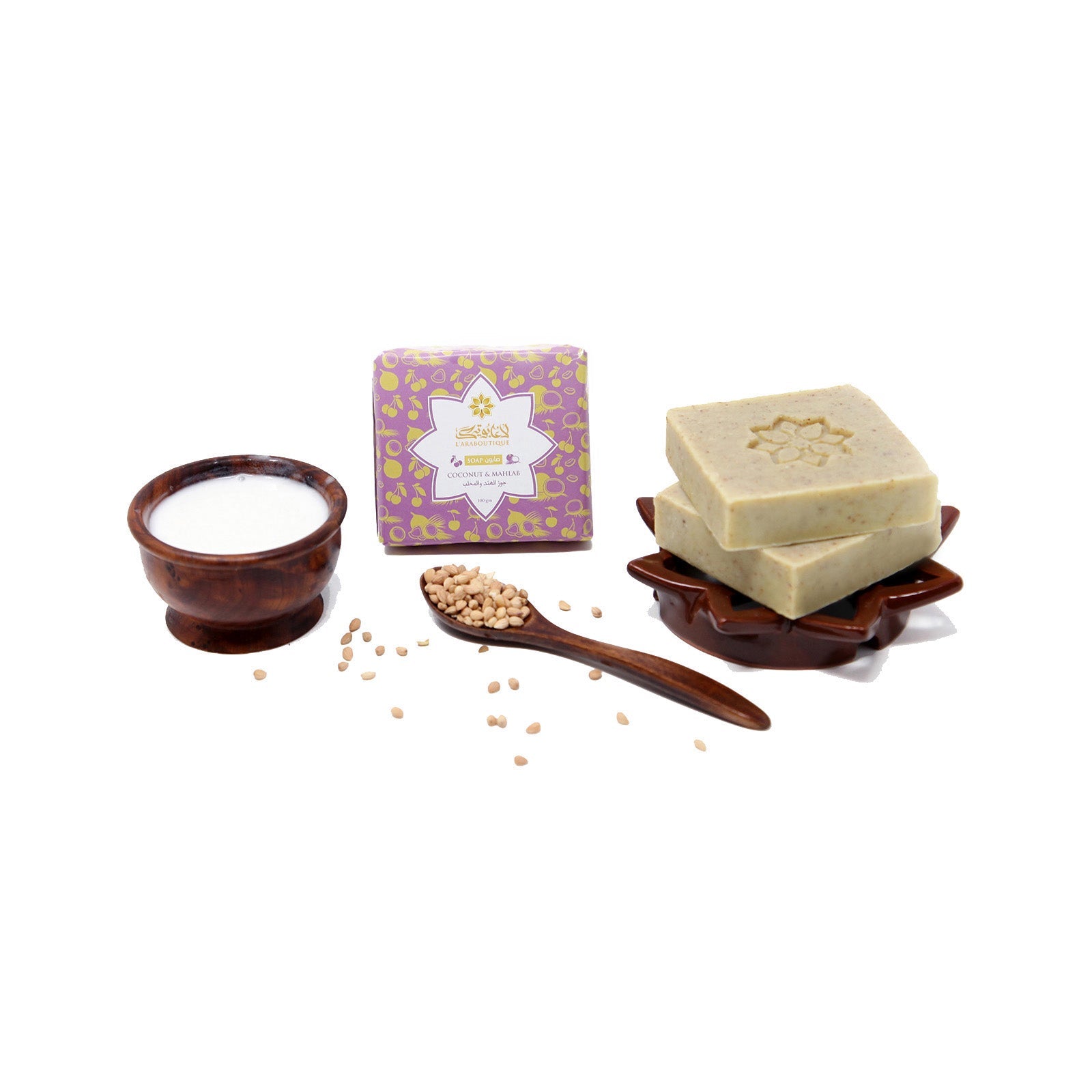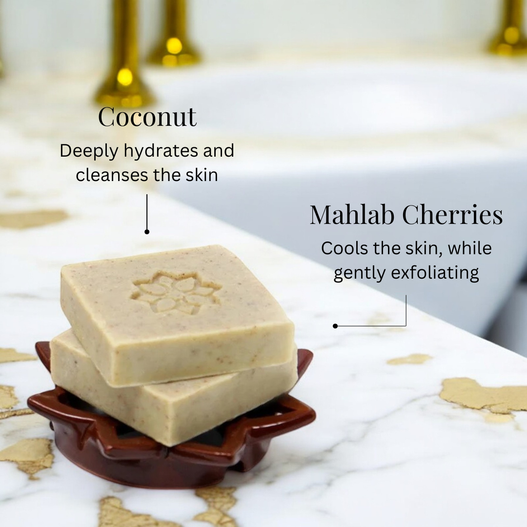 Sodium olivate (Extra virgin olive oil), Sodium sweet almondate (Extra virgin sweet almond oil), Cocos nucifera fruit juice (Organic coconut milk), Sodium shea butterate (Organic shea butter), Glycerin, Sodium castorate (Extra virgin castor oil), Prunus avium seed powder (Organic cherry seed/Mahlab powder).