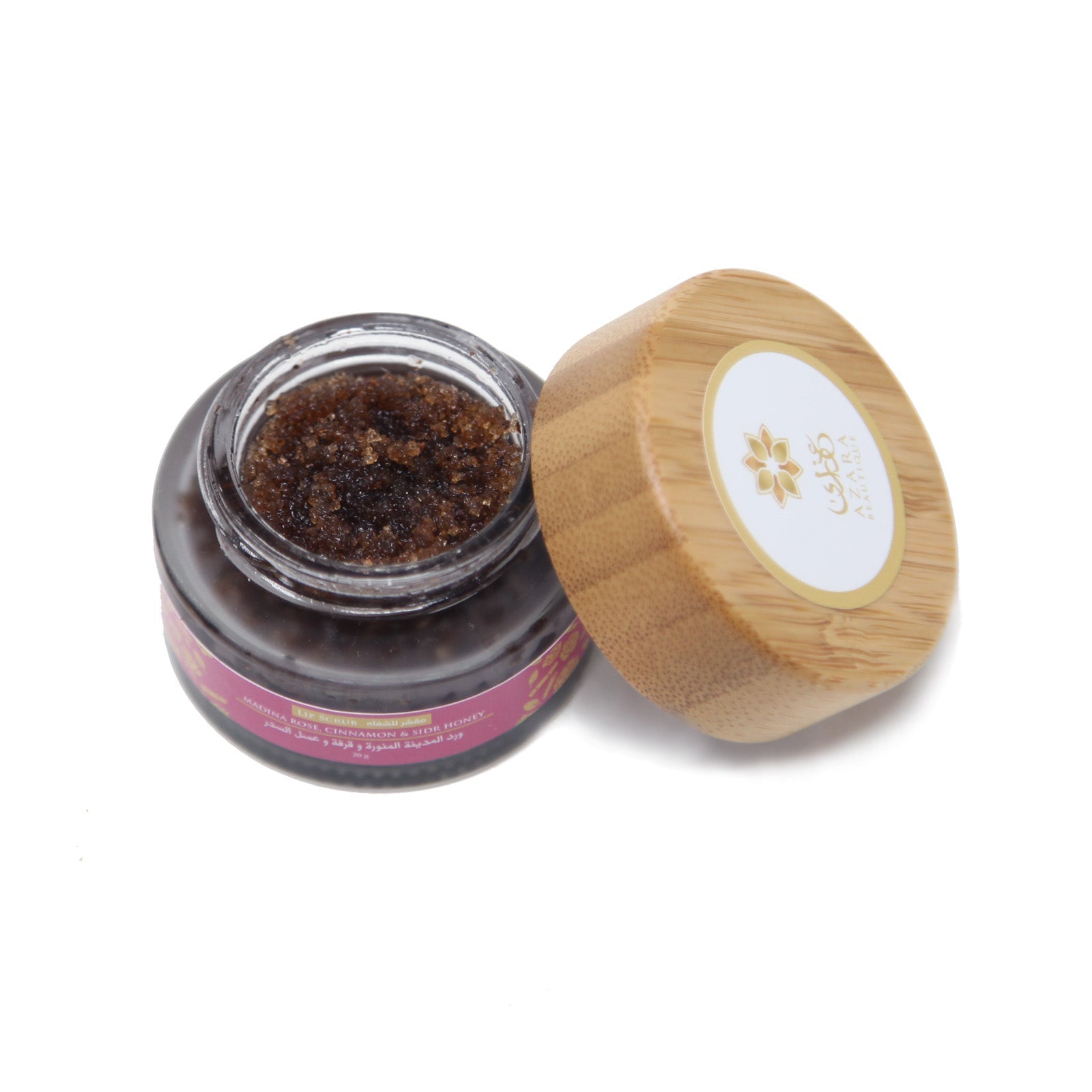 Sucrose (Faitrade brown sugar), Cinnamomum cassia bark extract (Organic cinnamon powder), Prunus amygdalus dulcis seed oil (Extra virgin sweet almond oil), Honey (Yemeni sidr honey), Rosa centifolia flower water (Pure Madina rose petals distilled in Zamzam mineral water), Pelargonium graveolens flower oil (Pure Madina rose essential oil), Benzyl alcohol (naturally extracted from plants) 0.7%, Salicylic acid 0.1%, Sorbic Acid 0.1%, Vegetable glycerin 0.04% Linalol (0.033%), Citral (0.002%) Geraniol (0.07%).